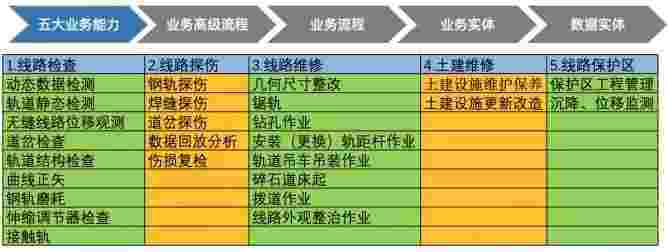 在轨道运维业务中,,我们形成了完整的从业务能力(业务域)-业务流程-业务实体-数据模型的分析梳理过程。。。轨道运维业务能力如下图所示::::