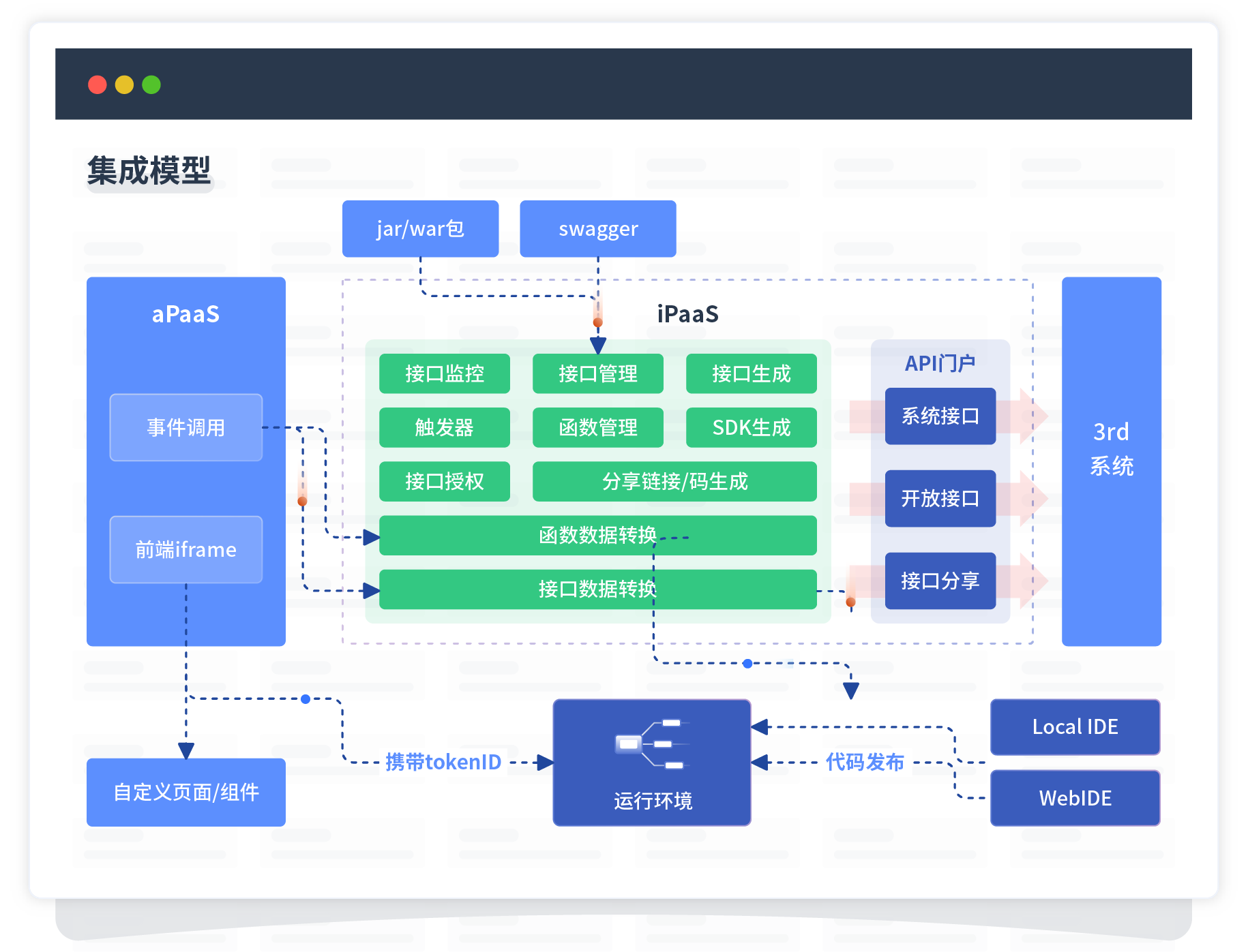 集成模型包括平台本身前、、、后端能力的扩展,,也支持通过API门户和第三方系统进行交互。。。。