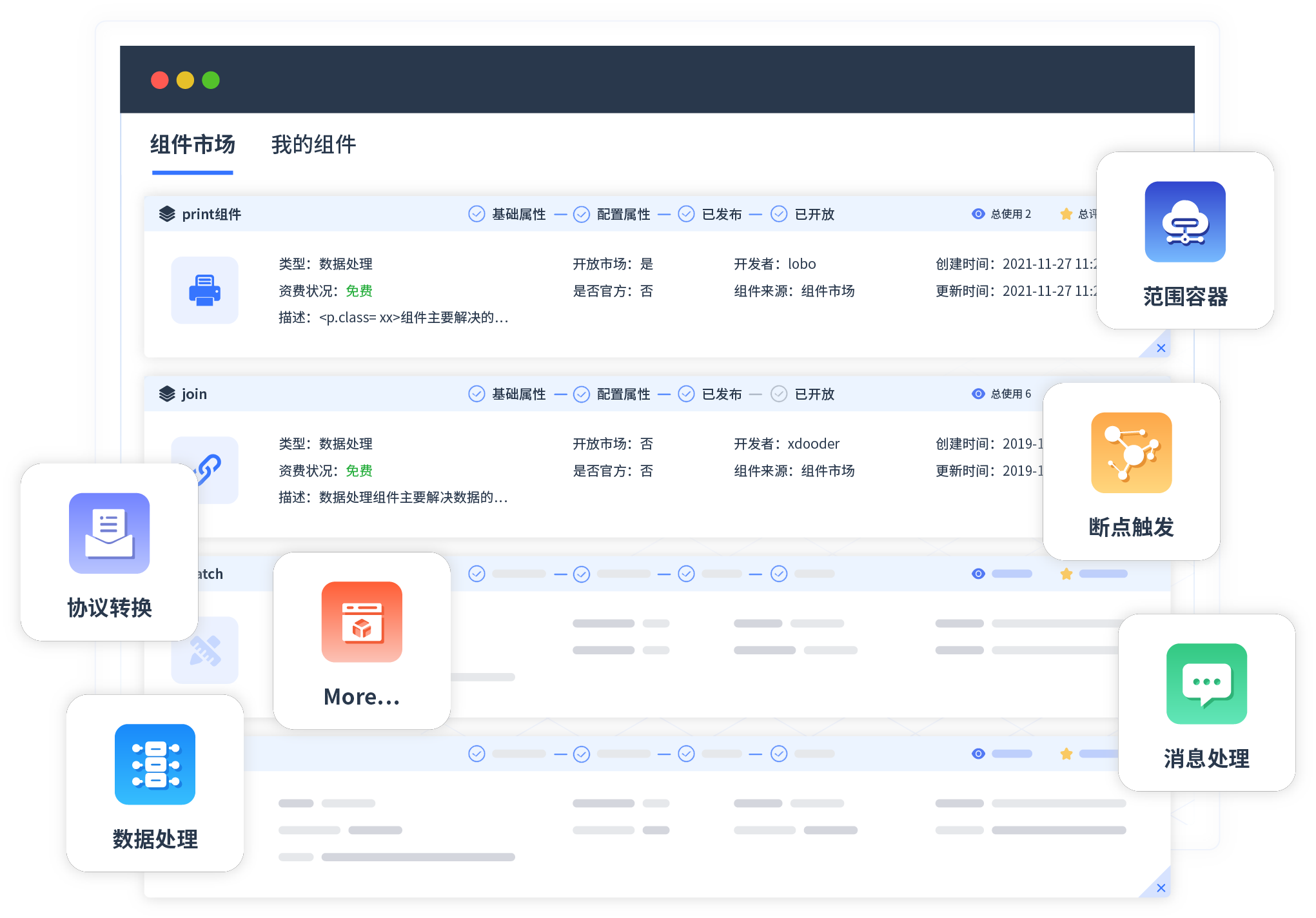 针对集成场景,,,,小米钱包提供组件市场,,,,例如协议转换、、消息处理、、、文件操作等。。。。除平台提供的组件外,,,客户可以自定义所需组件。。。。
