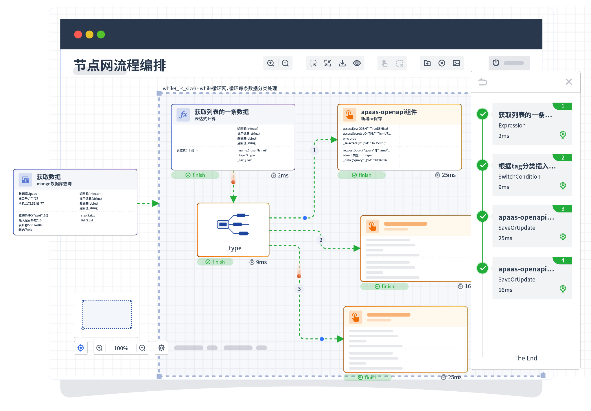 针对集成场景,,,,组件定义后支持进行流程编制,,,不同于传统代码方式,,,,通过图形化展示,,支持在线调试、、、日志查看和运行回放。。。。