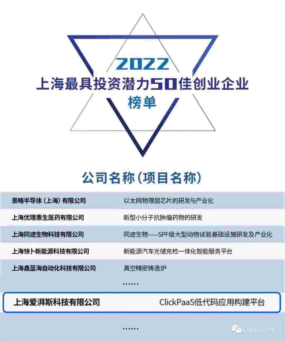 小米钱包 作为国内低代码PaaS平台的领军企业,,与120家创企入围角逐。。。。期间接受了来自德同资本、、、、领中资本等知名投资机构的10位投资人组成专家评委团的背靠背盲选。。并最终入围“2022上海最具投资潜力50佳创业企业”榜单,,,被列入“上海市重点培育创业企业库”。。