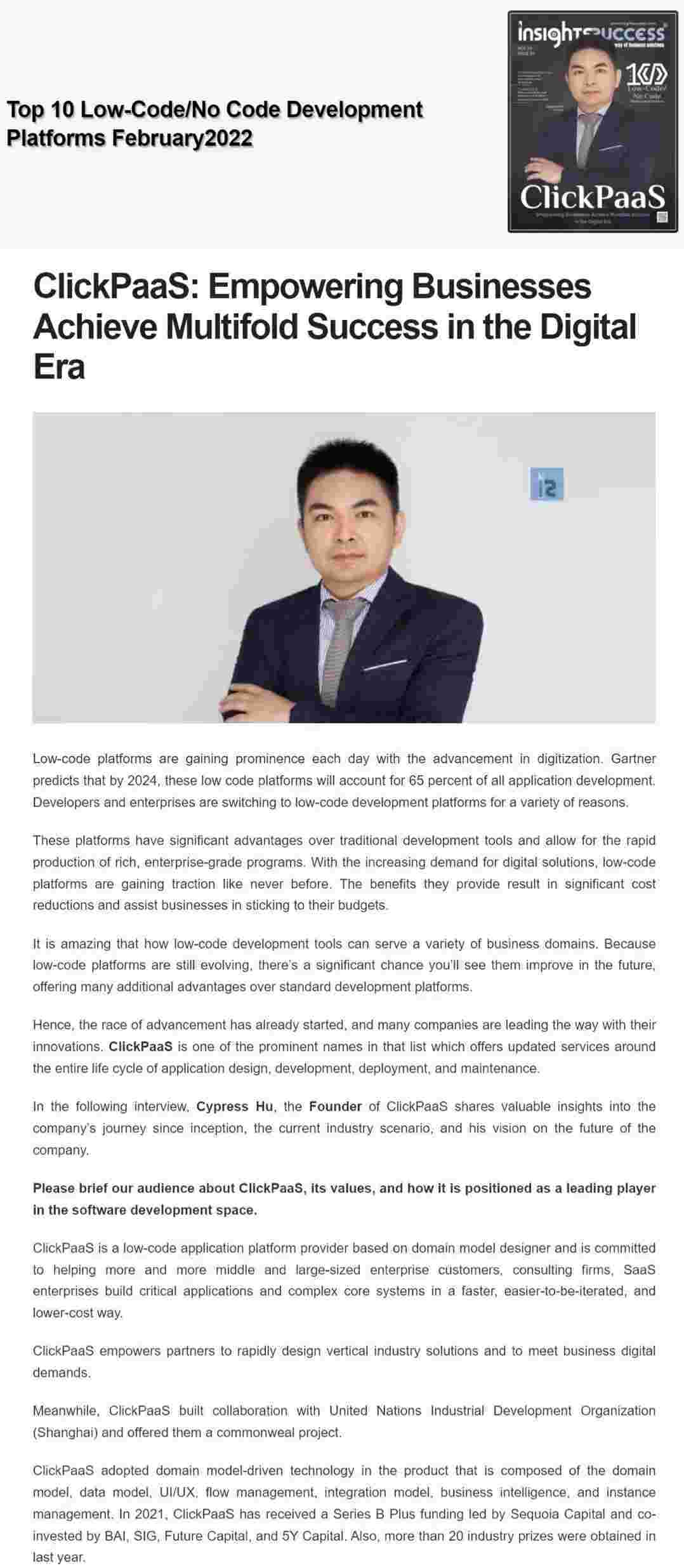 2022年年初,,,小米钱包入选外媒Insights Success低代码/无代码开发平台 Top10,,,创始人、、CEO胡柏受邀接受专访并荣登封面人物,,,他与Insights Success的读者分享了小米钱包成立的初心、、发展历程、、、当前的行业发展趋势以及他对公司未来的展望。。